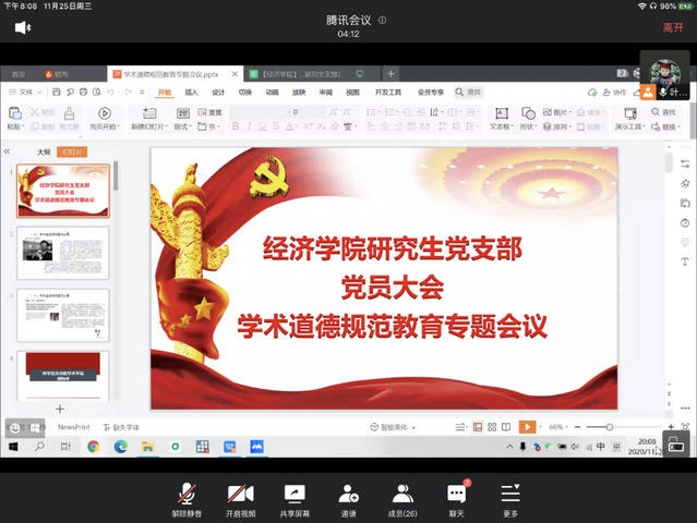2020年11月25日,经济学院研究生党支部在腾讯会议平台召开了学术道德规范教育专题会议,会议由研究生党支部书记叶茂坤主持,全体党员参加会议。