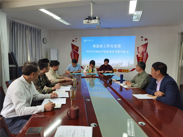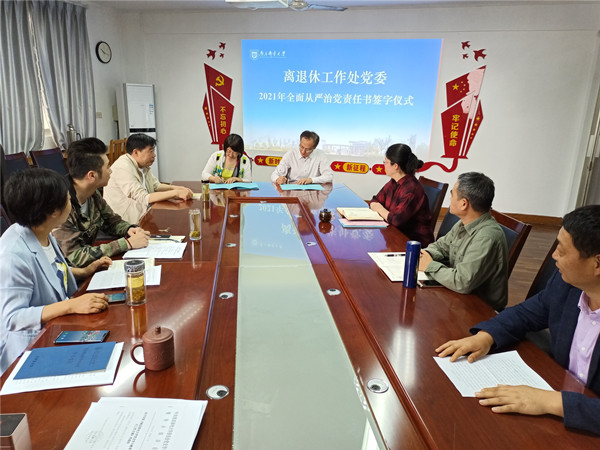 5月7日,离退休工作处党委在三牌楼校区二楼阅览室举行“2021年度全面从严治党责任书签订仪式”。处党委班子成员、党风联络员、特邀监察员、全体在职党员参加仪式,签订仪式由处党委书记兼处长褚晓红同志主持。