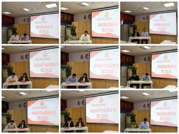 为深入落实党中央、校党委全面从严治党工作要求,推动全面从严治党向纵深发展,5月12日上午,材料科学与工程学院党委组织举行全面从严治党责任书、廉政建设责任书签订仪式。活动由学院党委书记赵允玉主持,全体院领导、研究所所长、系(中心)主任、各支部书记、党风联络员、特邀监察员等参加会议。