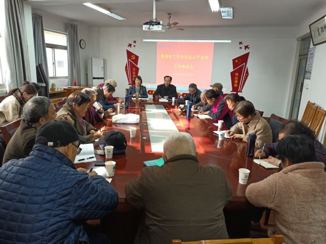 11月11日上午,离退休工作处党委在三牌楼校区二楼阅览室召开全面从严治党专项工作推进会。全体处党委委员、退休党支部书记及委员,我处特邀监察员和党风联络员、部分在职工作人员共三十余人参加会议。会议由处党委书记、处长褚晓红同志主持。