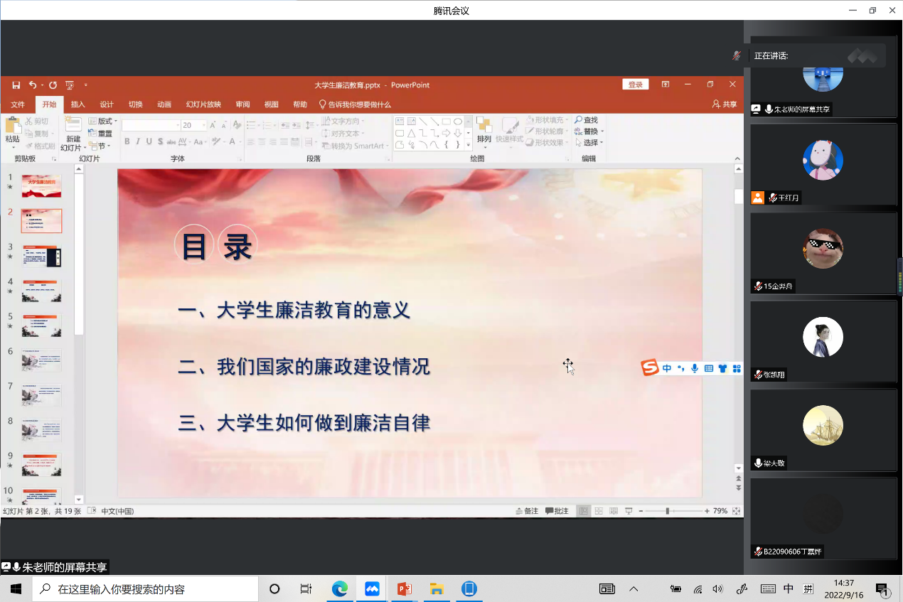 为配合校园廉洁文化月活动,9月16日下午,理学院党委以新生入学教育为契机,开展了线上专题廉洁教育活动。理学院专职纪检委员朱皓、新生辅导员及2022级全体新生参加了会议。