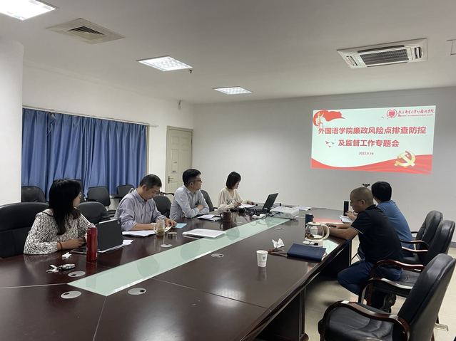 9月19日,外国语学院党委召开廉政风险点排查防控工作专题会。全体院党委委员参加会议。院党委书记陈晓波主持会议。