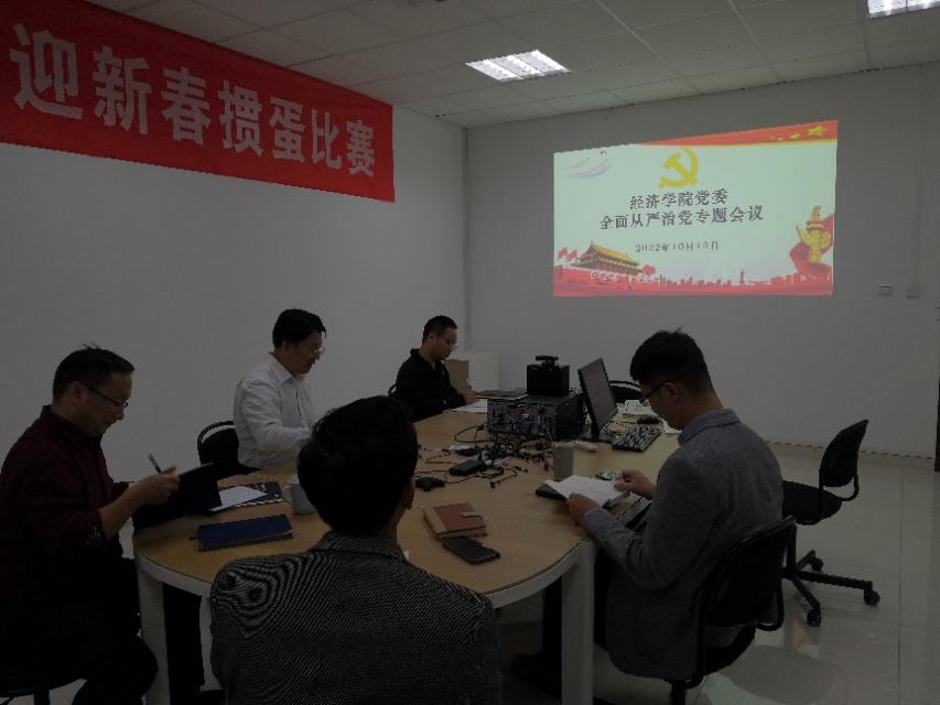 10月12日下午,经济学院党委在文科楼522会议室举行了全面从严治党专题会议。学院全体领导班子成员参会,会议由学院党委书记黄宝凤主持。黄宝凤书记首先传达了南京邮电大学2022年警示教育大会和第三届党委第七轮巡察工作动员部署会的会议精神。他指出学院领导班子成员要以此次专题会议为契机,扎实做好党风廉政建设工作,永葆忠诚干净担当的政治本色,营造风清气正的政治生态和良好的育人环境。随后,学院纪检委员董军领学了《关于新形势下党内政治生活的若干准则》《中国共产党巡视工作条例》等法规文件。与会人员集体云参观了“南京市栖霞区党的纪律建设教育馆”网上展厅。全面从严治党只有进行时,没有完成时。通过此次专题会议,学院党委将继续坚持严的主基调,把全面从严治党贯穿于党建各方面,为学校“双一流”和高水平大学建设做出积极贡献。