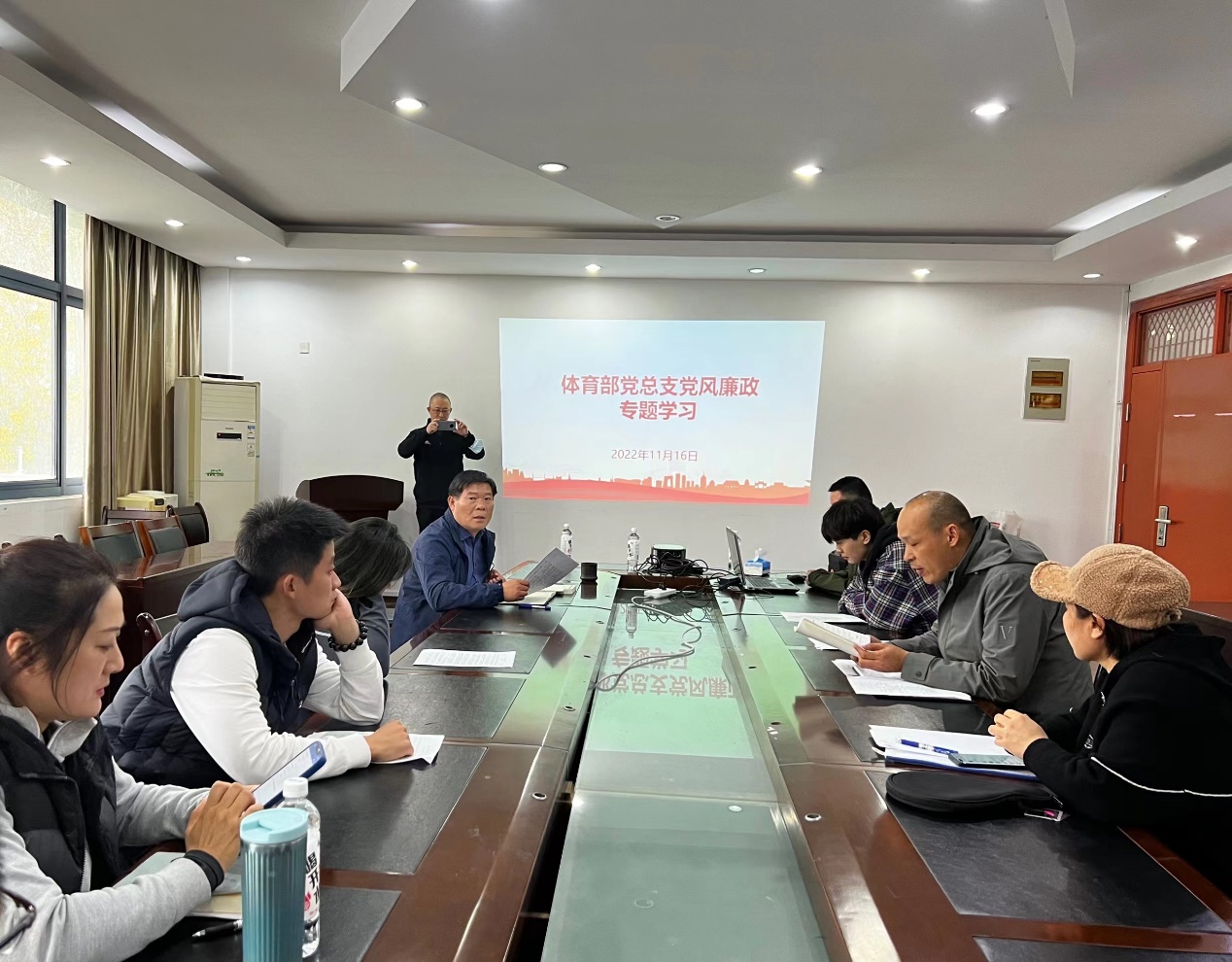 11月16日,体育部党总支在体育馆202会议室召开党风廉政专题,会议由党总支书记陈友民主持。