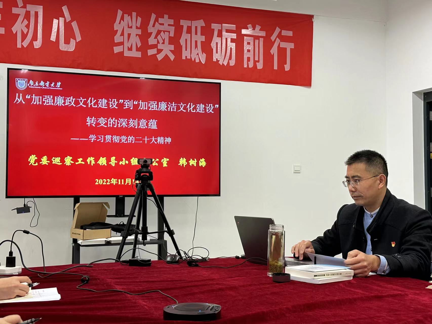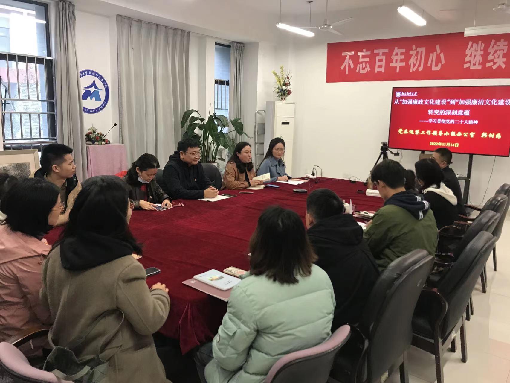 11月14日上午,为学习贯彻党的二十大精神,进一步推动和加强学院党风廉政建设,学院举办党风廉政建设专题讲座,讲座由教工第一党支部承办,校巡察工作领导小组办公室副主任韩树海应邀在文科楼120会议室为我院教工一支部、二支部全体党员线上线下上了一堂题为《从“加强廉政文化建设”到“加强廉洁文化建设”转变的深刻意蕴——学习贯彻党的二十大精神》的专题讲座。
