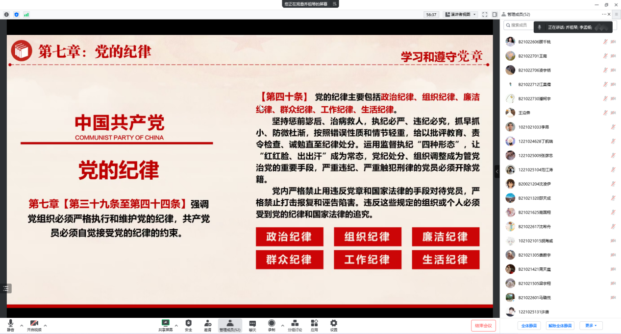 经过本次讲座,学员们深刻理解了党章党规党纪的重要性,并在未来的生活和学习中,不断增强纪律意识、筑牢思想防线,以共产党员的标准严格要求自己,时刻注意自身言行,遵纪守法、团结同学、悉心服务,用青春力量助推学校的高质量发展。