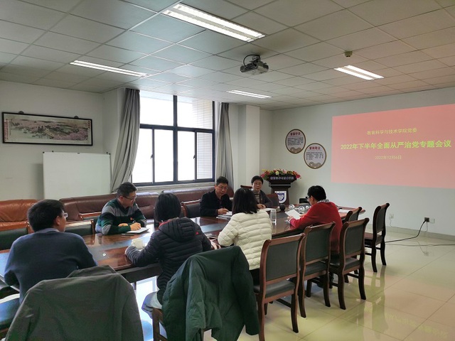 为深入学习贯彻党的二十大精神,认真落实全面从严治党工作向纵深发展,12月6日,教育科学与技术学院党委在文科楼426会议室组织召开2022年度下半年全面从严治党专题会暨党风廉政建设工作会,会议由党委书记彭洋主持,学院党委委员参加会议,特邀监察员、党风联络员列席会议。