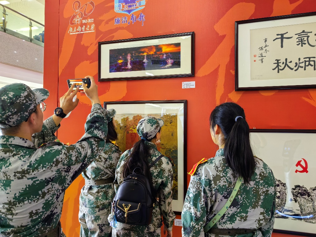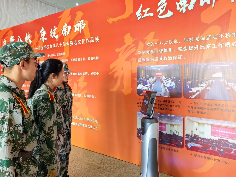 跟随着讲解机器人的介绍,学生们先后参观了学校办学历史、廉洁书法和绘画作品等内容,通过观赏主题鲜明、立意高深的廉洁主题书画作品,吸纳作品中展现的清廉、儒雅、高洁的精神,陶冶高尚道德情操。