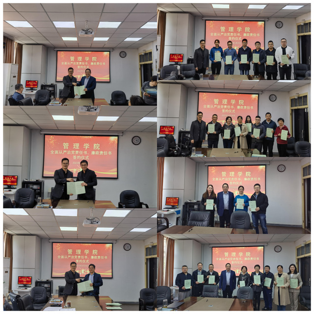 在与会人员的见证下,学院党委书记钟凯与学院领导班子成员、党支部书记、系部中心负责人签订全面从严治党责任书,院长黄卫东与非党员系部中心负责人签订廉政责任书。