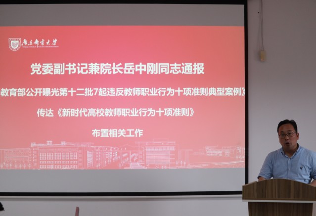 董军书记首先传达了学校2023年师德师风建设工作会议精神和学校教师工作部《关于组织开展师德师风专题学习活动的通知》文件内容,从加强组织领导、系统查漏补缺、做好宣传总结三个方面对学院2023年师德师风建设工作进行了安排部署。岳中刚院长通报了《教育部公开曝光第十二批7起违反教师职业行为十项准则典型案例》,传达了《新时代高校教师职业行为十项准则》,从坚定政治方向、自觉爱国守法、传播优秀文化、潜心教书育人、关心爱护学生、坚持言行雅正、遵守学术规范、秉持公平诚信、坚守廉洁自律、积极奉献社会十个方面对全院教职工提出要求并布置了相关工作。王子敏副院长传达了《江苏省高校教师师德失范行为处理办法(试行)》,着重强调了师德失范行为的种类内容和相关处理规定。杨小军副院长传达了《江苏省研究生导师职业道德规范"十不准"(试行)》,从研究生招生、培养、毕业等方面对学院研究生导师师德师风方面提出具体要求。