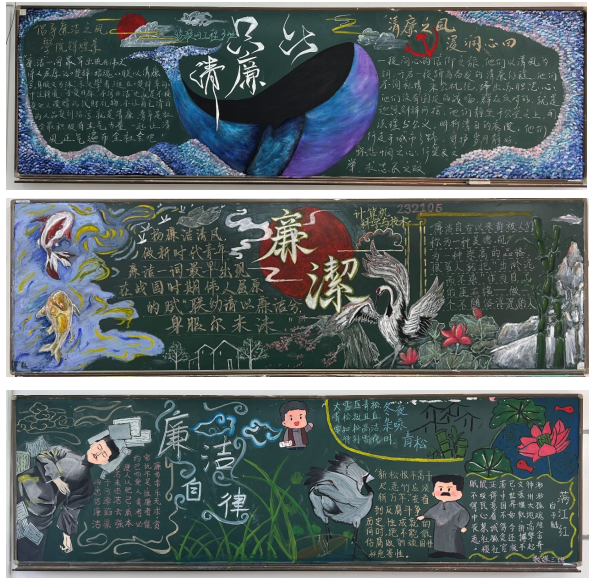 “廉洁伴我行”主题黑板报评比活动。以板报宣传阵地为载体,组织新生利用课余时间围绕“廉洁”主题精心设计版面,绘制插画、编排内容,以图绘廉、以文述廉,对廉洁文化进行全方位、多角度的介绍和宣传,并从版面构图、创意和视觉效果等对学生作品进行公正评比,对获奖作品进行展示,积极营造崇廉尚洁的校园文化氛围,充分发挥环境潜移默化的教育和熏陶作用。