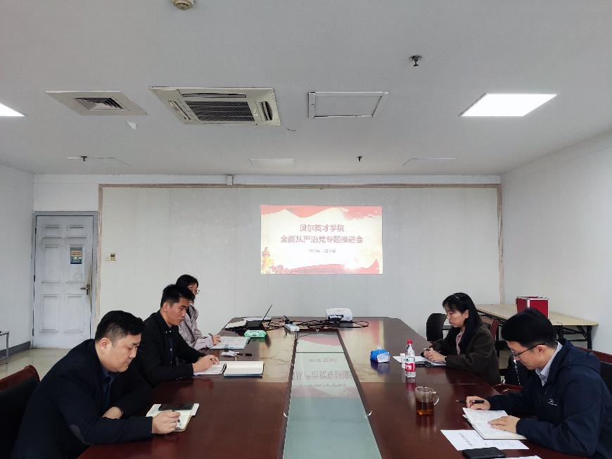 11月10日上午,贝尔英才学院召开全面从严治党专题推进会,学院领导班子成员、办公室主任、分团委书记、党委组织员等参加会议,会议由学院党委书记毛建平主持。