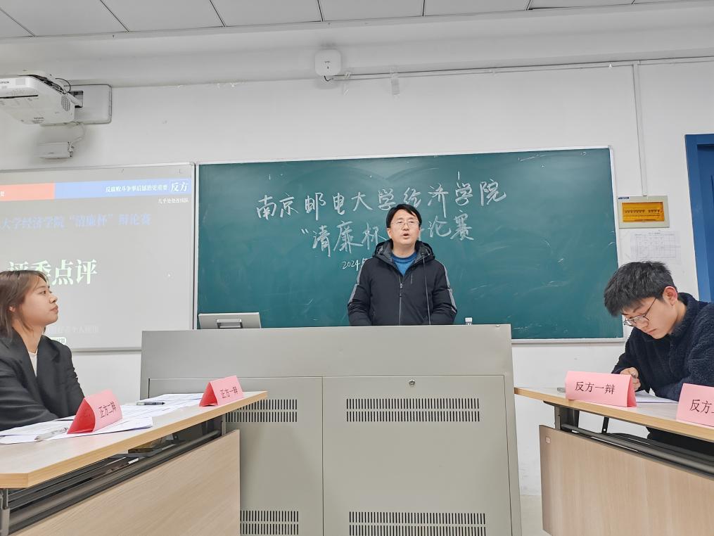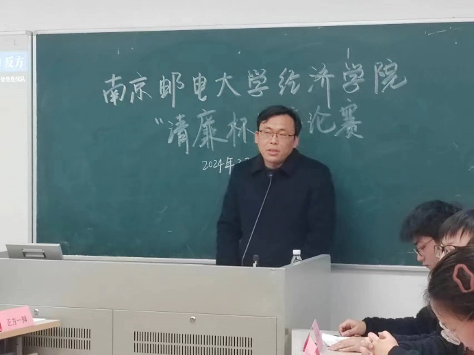 为深入落实习近平总书记关于青年工作的重要思想、加强新时代廉洁文化建设的重要讲话精神,引导青年学生通过辩论增进对廉洁文化、青年担当及未来发展的探讨,3月27日下午,经济学院党委在仙林校区教3-213-1教室举行第二届“清廉杯”辩论赛院赛决赛。校纪委案件审理处处长张建波老师,经济学院党委书记董军老师,经济学院党委纪检委员、副院长杨小军老师应邀出席,校辩论队成员叶文喆和杨禛同学担任学生评委。
