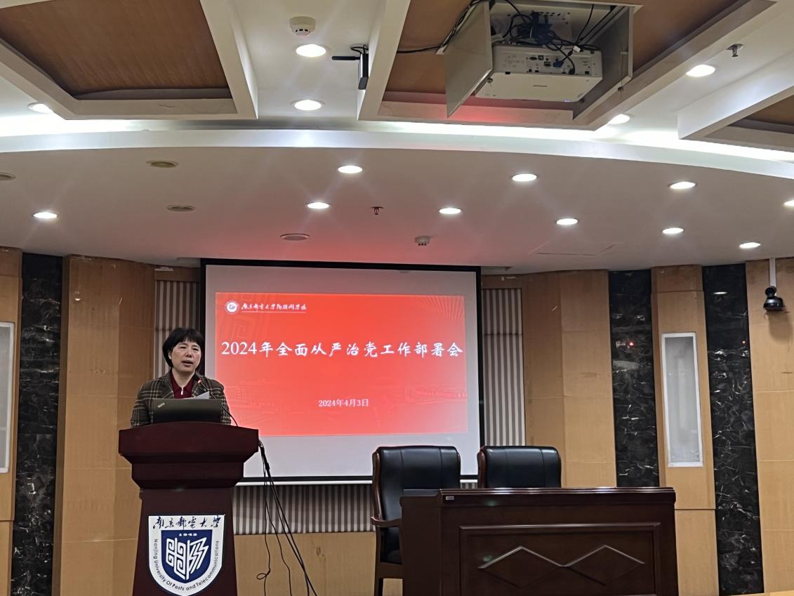 会议由党委书记邓艳华主持。首先,邓书记传达了学校党委2024年工作要点及全面从严治党部署会精神,总结回顾2023年学院党建与全面从严治党工作取得的主要成绩,并从深入强化思想武装、组织建设强基创优、全面推进从严治党与凝聚统战群团力量四个方面部署了2024年全面从严治党工作任务。邓书记强调,要深入学习贯彻习近平总书记重要讲话精神,提高政治站位,强化基层建设,不断增强责任感、使命感和紧迫感,纵深推进全面从严治党,引领保障学院高质量发展,推进校第四次党代会精神落地落实。