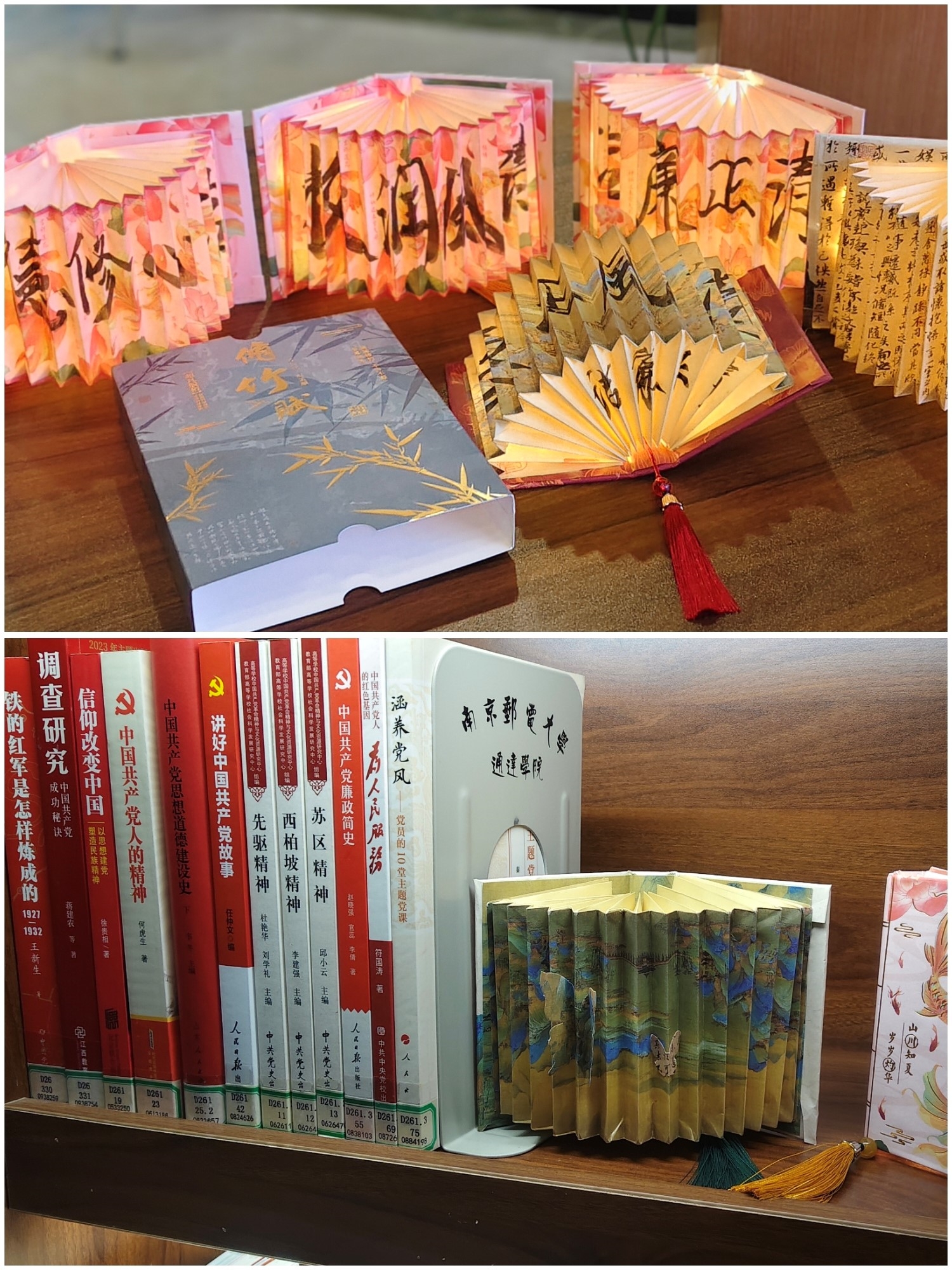 活动伊始,师生们参观了沉浸式廉洁文化教育空间“清风书廊”,在墨香与典籍中感受廉洁文化的深厚底蕴。随后,大家以笔墨、宣纸、LED灯等材料为载体,将廉洁元素融入书灯设计:有的学生以周敦颐《爱莲说》为灵感,在灯面上勾勒“出淤泥而不染”的莲花;有的学生剪出了“竹节”纹样,寓意“气节如竹、清正立身”;还有学生将“清”“正”“廉”“洁”四字书写于灯体,搭配暖黄色灯光,营造出“光影映廉心”的意境。