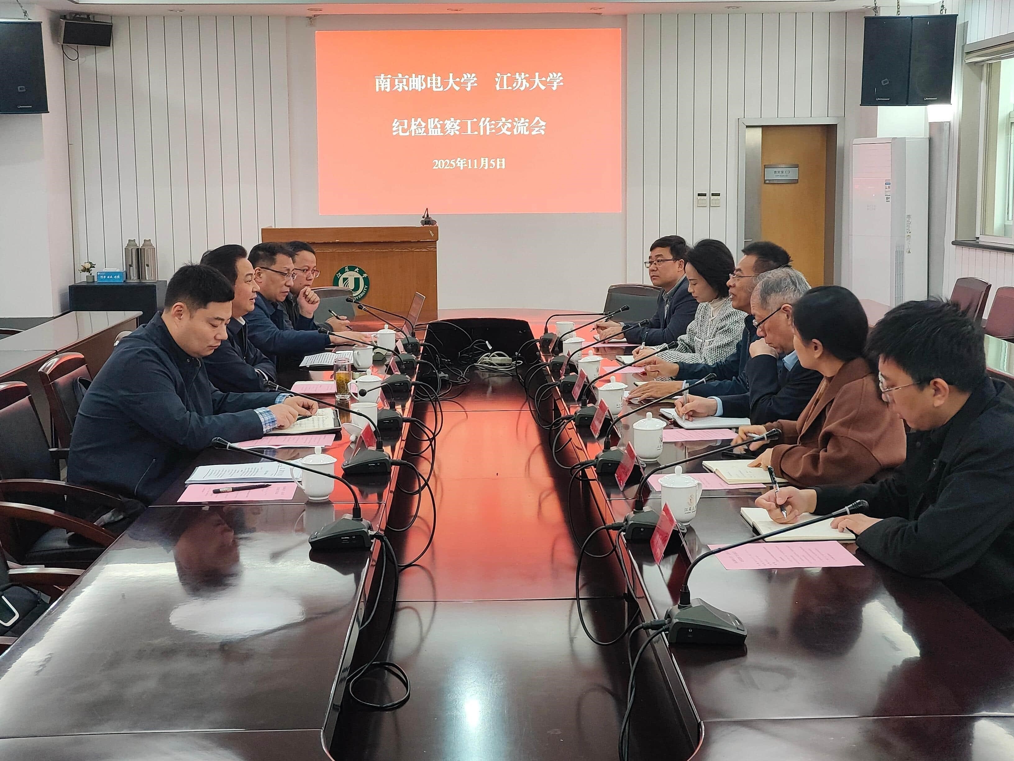 11月5日,省纪委监委派驻南京邮电大学纪检监察组组长、党委常委、纪委书记周和林一行赴江苏大学,重点围绕“监督一点通”平台建设开展调研交流。江苏大学纪委书记、派驻监察专员杜永春主持座谈会。双方纪检监察机构、我校信息化建设与管理办公室相关同志参与交流。